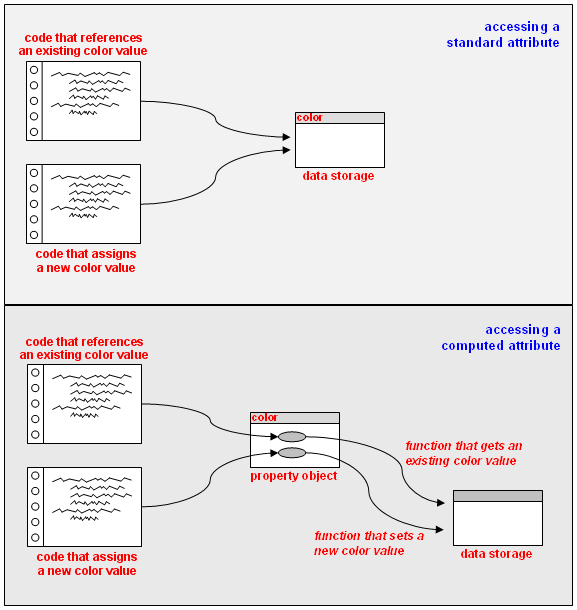 Now, when a program makes a reference to the attribute color{.backtick} through a Widget instance wgt{.backtick}, the property object dispatches get_color{.backtick}, which retrieves the color_data{.backtick} value and returns an (R,G,B) tuple. Similarly, when a program makes an assignment to the attribute color{.backtick}: